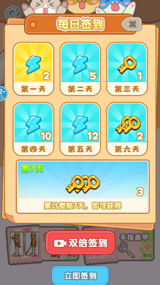 2、通过每日签到可以获取闯关能量,还能使用游戏内提供的特别钥匙。