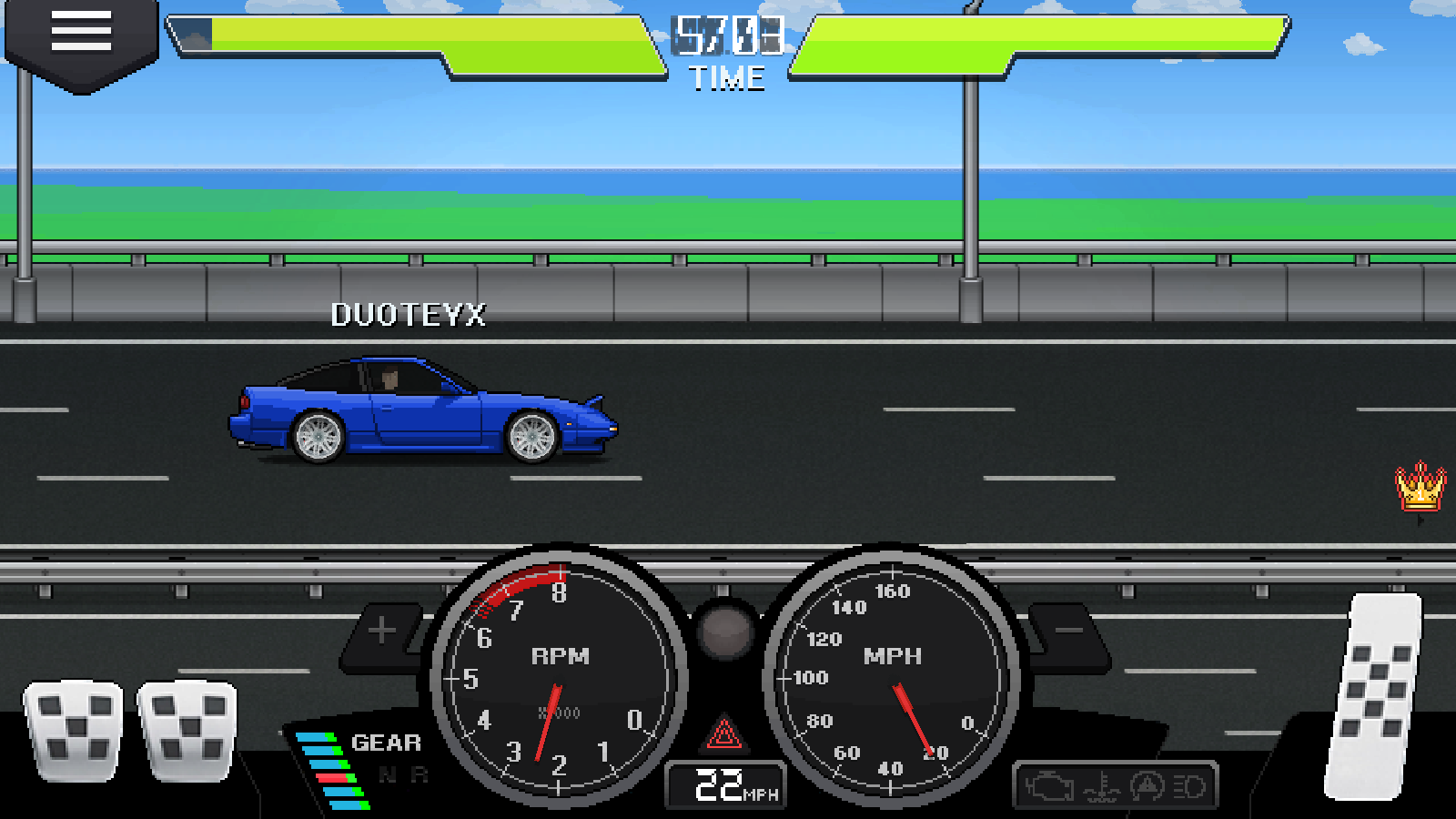 游戏的画面充满怀旧感,赛道上霓虹闪烁的街头路灯、改装车库里清晰可辨的扳手等工具,还有车辆行驶时排气管喷出的像素烟雾等细节,搭配动态光影效果,既保留了经典像素韵味,又增强了视觉层次。同时,游戏还原了真实的驾驶音效,涡轮介入的轰鸣、换挡时的机械声等,搭配完善的仪表盘、转速表等界面元素,让玩家沉浸式感受竞速的紧张感。车辆方面也以像素风高度还原了 JDM 跑车、肌肉车等经典车型,低趴姿态、宽体套件等特征都极具辨识度。