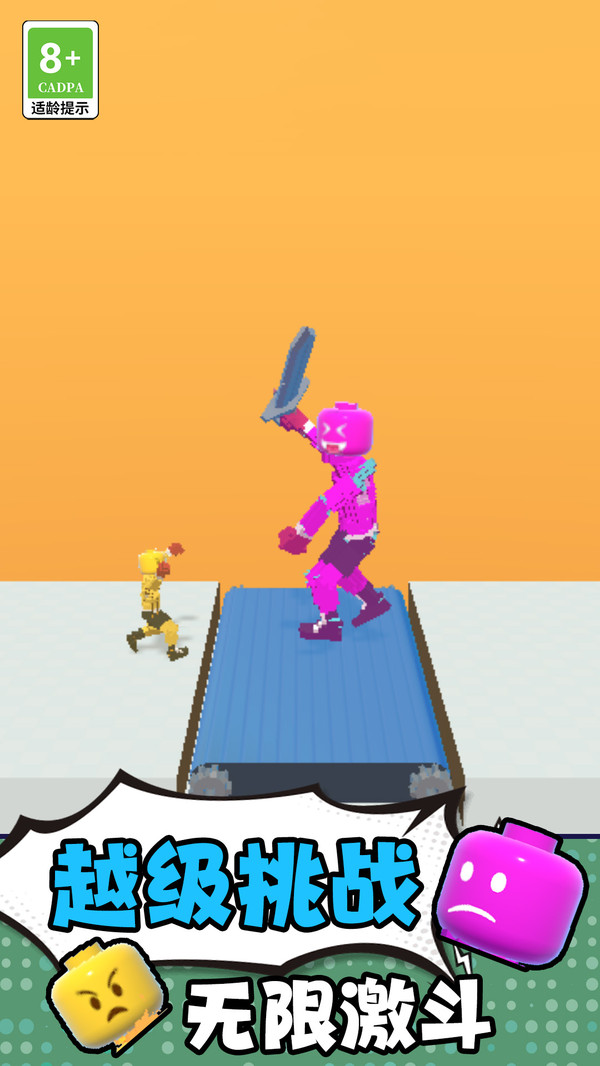 1、击打对手不仅造成伤害,还会使其身体崩解出像素块散落在地。玩家操控角色触碰吸收这些像素块后,能永久性地增大自身体型。
