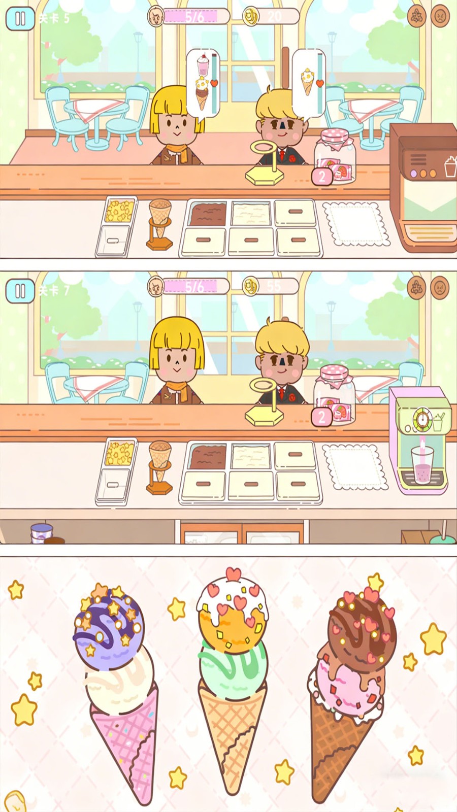 1、每个关卡都能解锁新的冰淇淋,玩家要给客人们制作多种口味冰淇淋,获得更多收益。