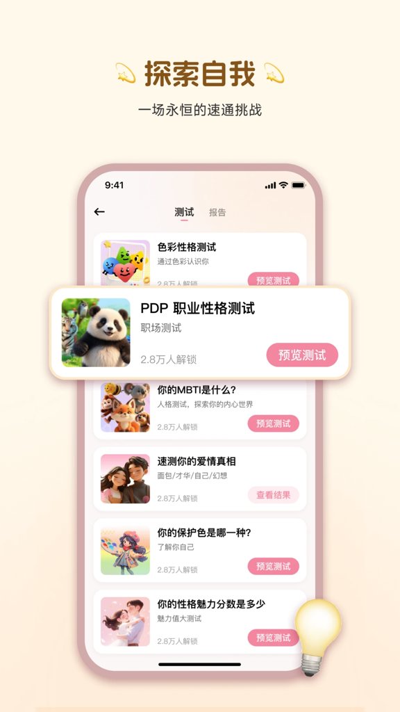 专业心理测评系统:基于MBTI、九型人格等权威理论开发,通过趣味测试帮助用户快速了解性格特质与情绪模式。