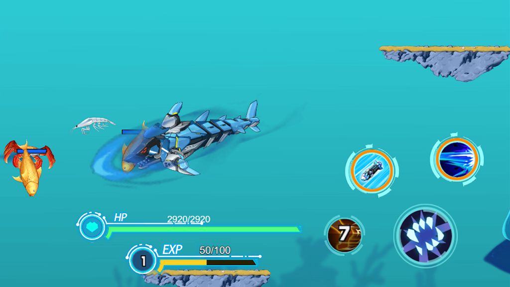 吞噬成长:操控机械鲨鱼捕食小鱼、海鸟、鲸鱼等生物获取能量 / 资源,提升等级、解锁技能,避免生命值清零。
