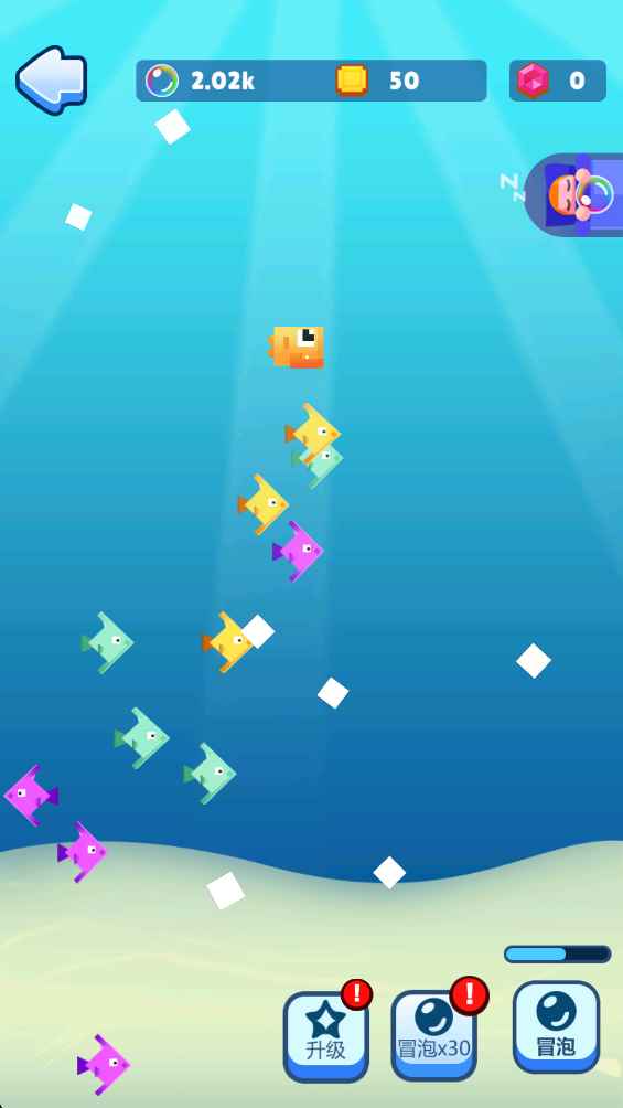 2、收集气泡解锁装饰道具,打造专属小鱼之家,同时积累分数,逐步解锁新玩法与更广阔的海域地图。