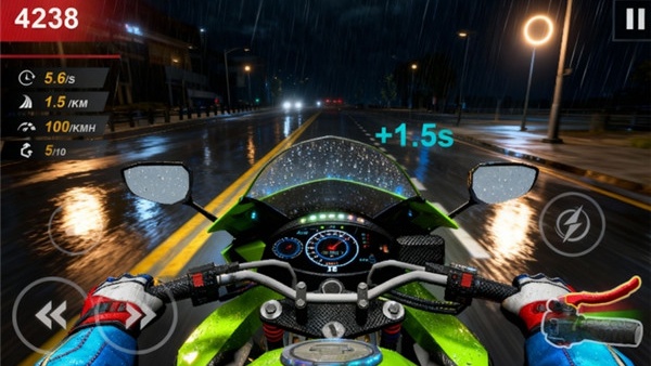1. 玩家通过重力感应或虚拟按键控制摩托车的倾斜过弯、加速和刹车,并需掌握专业的压弯技巧以保持高速通过复杂弯道。