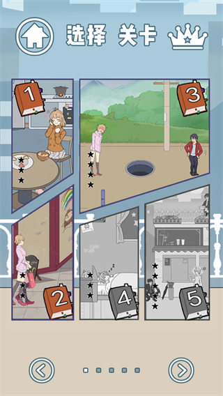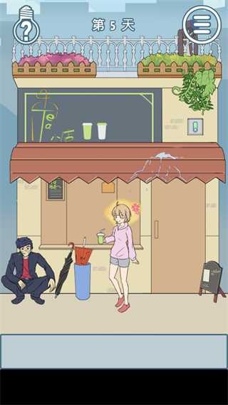 第一关 点击冰箱上的磁铁,这个不起眼的小道具可是通关的关键。将磁铁小心地放到饺子盘上方,利用磁力把藏在饺子里的硬币吸出来。这个步骤需要一定的耐心和精准度,成功后再点击开始按钮就能顺利通关。 第二关 这关需要你帮助女友屏蔽噪音。首先找到场景中的耳机,将它轻轻地戴在女友耳朵上。接着点击咖啡店门口闪烁的门牌,等音乐停止后点击开始,就能看到女友露出满意的笑容。 第三关 这一关考验你的观察力和动手能力。首先把碍事的香蕉挪到一边,然后找到藏在电线杆后面的井盖。将井盖准确地放回原位后,还需要把水池里的标尺(那个带有刻度的长杆)稳稳地放在井盖上,这样才能确保安全通过。 第四关 这个关卡需要你分步骤完成多个操作。先在场景二的洗漱台上找到刷牙杯,从中获得重要的道具螺丝刀。接着点击柜子会出现一个隐藏的开关,用螺丝刀调整开关后,就能控制冷热水装置。先打开水龙头放满水,再调节开关让水温升高,等镜面起雾后及时关闭开关。最后回到第一个场景,点击闹钟唤醒女友,整套操作需要一气呵成。 第五关 在最后一关,你要先找到藏在粉色花丛中的剪刀。这把剪刀是解决问题的关键道具,将它拖动到右边建筑物上的藤蔓处,剪断缠绕的藤蔓后会露出雨棚的开关。点击开关启动保护装置,再点击开始按钮,就能帮助女友避开突如其来的雨水。