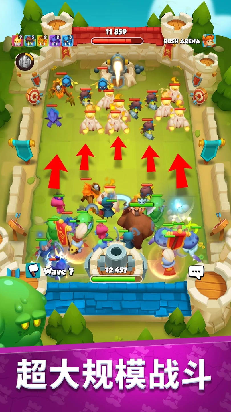 对抗技巧:用体型优势撞击对手英雄,打断其合并与技能;避开敌方高星英雄,优先集火残血单位。