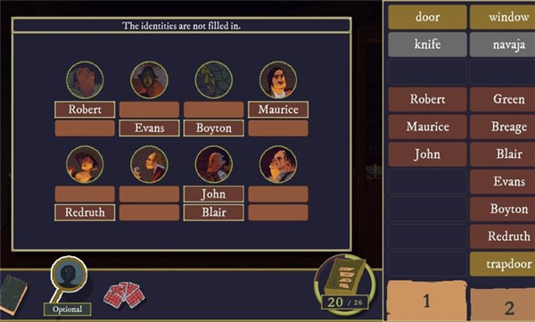 需先确定人物身份,再推导动机与手法,填空错误会有提示,引导修正逻辑。
