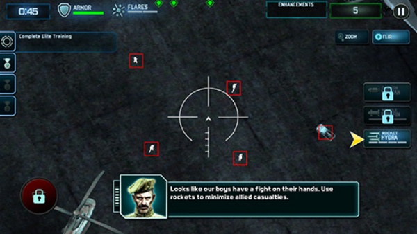 操作并不复杂,玩家只需要在挑战中滑动屏幕来回的移动自己的视角并发现地图中的目标就能发起攻击,有时候甚至还需要你切换机枪或是导弹消灭不同的敌人,随着玩家对无人机的升级,你能使用的武器和无人机的性能也会产生不同的变化。