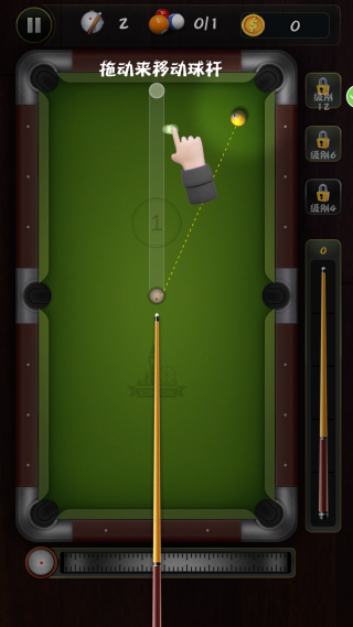 1、点击开始游戏,拖动球杆来调整位置,需要掌握好瞄准的方向。