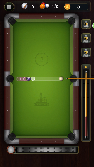 4、在击球前可以自由拖动画面以查看台面全局,并利用辅助线来预判球的碰撞与行进路径。