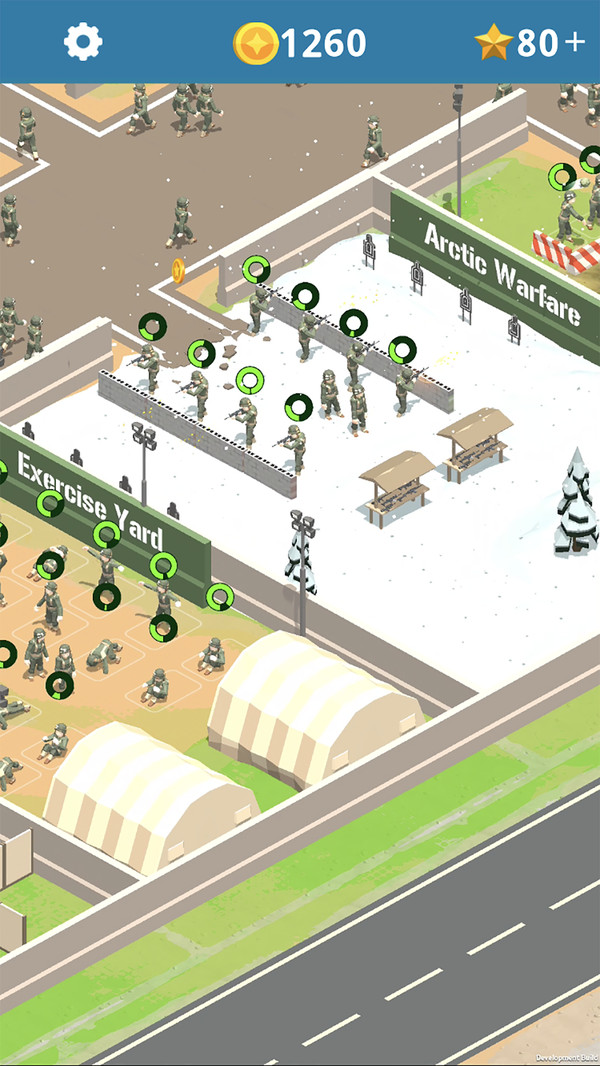 放置核心循环:训练士兵产生金币,用金币升级 13 种差异化训练场地(如运动场、障碍场、火炮阵地等),提升训练效率、容量与队列规模,形成 “训练→收益→强化→更强训练” 的正向成长闭环。