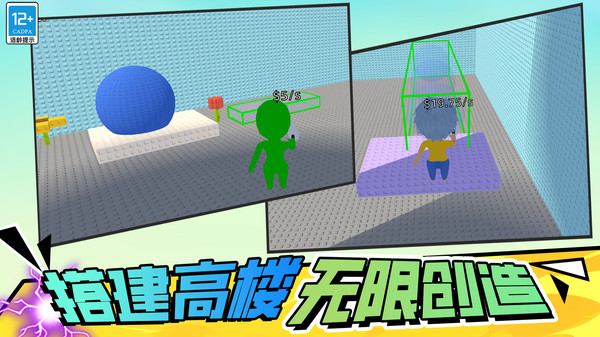 1、玩家从平地开始,在网格上选择和放置积木,搭建塔楼的每一层。建成的楼层会自动周期性地在顶部生成金币气泡,需要玩家点击收取。