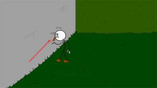 3、潜入阶段按指引操控火柴人使用道具,在建筑旁草地区域缓慢推进,逐步靠近目标建筑避开危险。