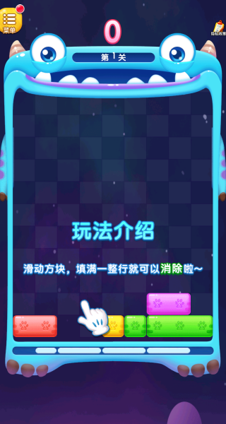 1、滑动屏幕移动方块,将相同类型或满足条件的方块排列成完整一行,即可触发消除效果。