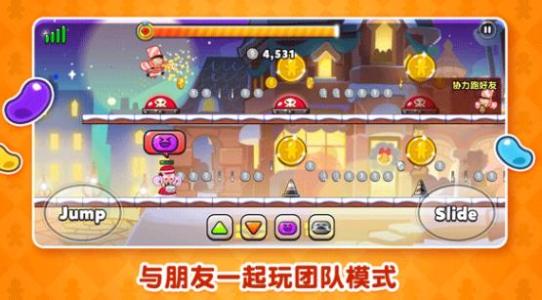 操作方式:游戏以横向操作为主,玩家通过点击屏幕左下方的按键控制姜饼人跳跃,右下方的按键控制滑垒,以此躲避障碍物并收集果冻。