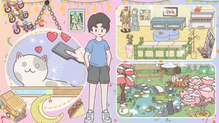 购买猫咪并照顾,通过抚摸、剪指甲、洗澡等小游戏与猫咪互动,获取爱心。