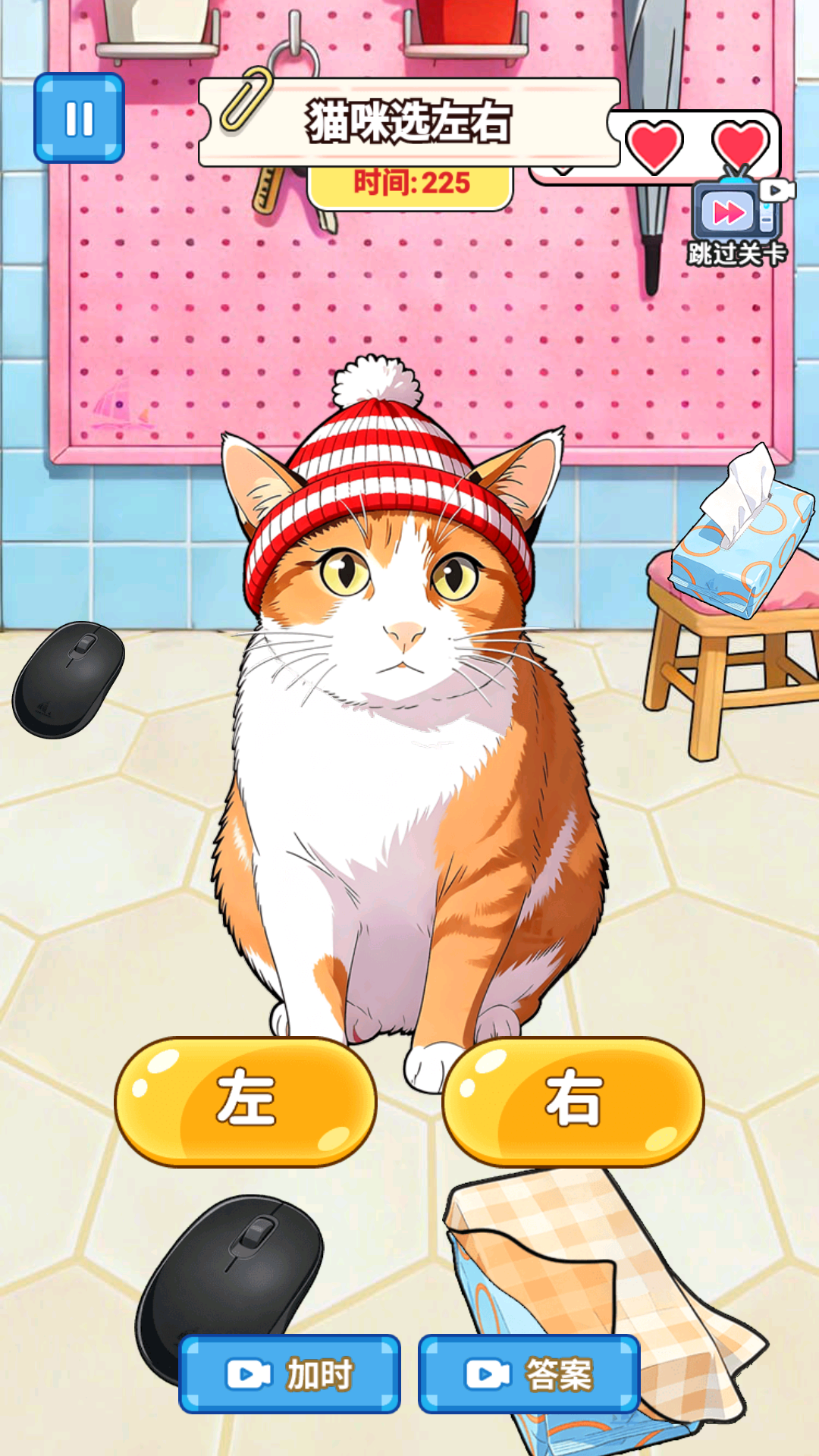2、观察关卡中出现的物品,结合 “左右” 选项的位置,再点击对应按钮完成选择。