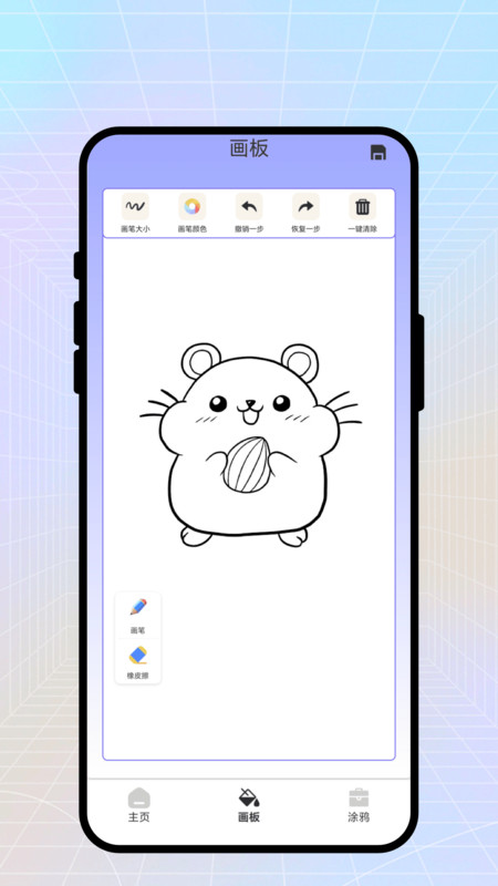 1、安装app进入画板页面,展示了画笔、橡皮擦等功能,轻松创作。