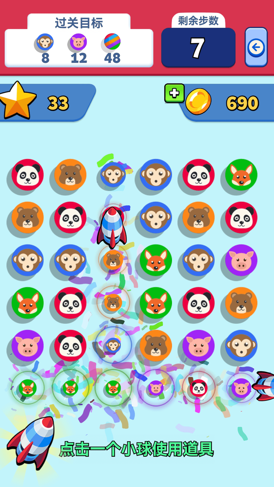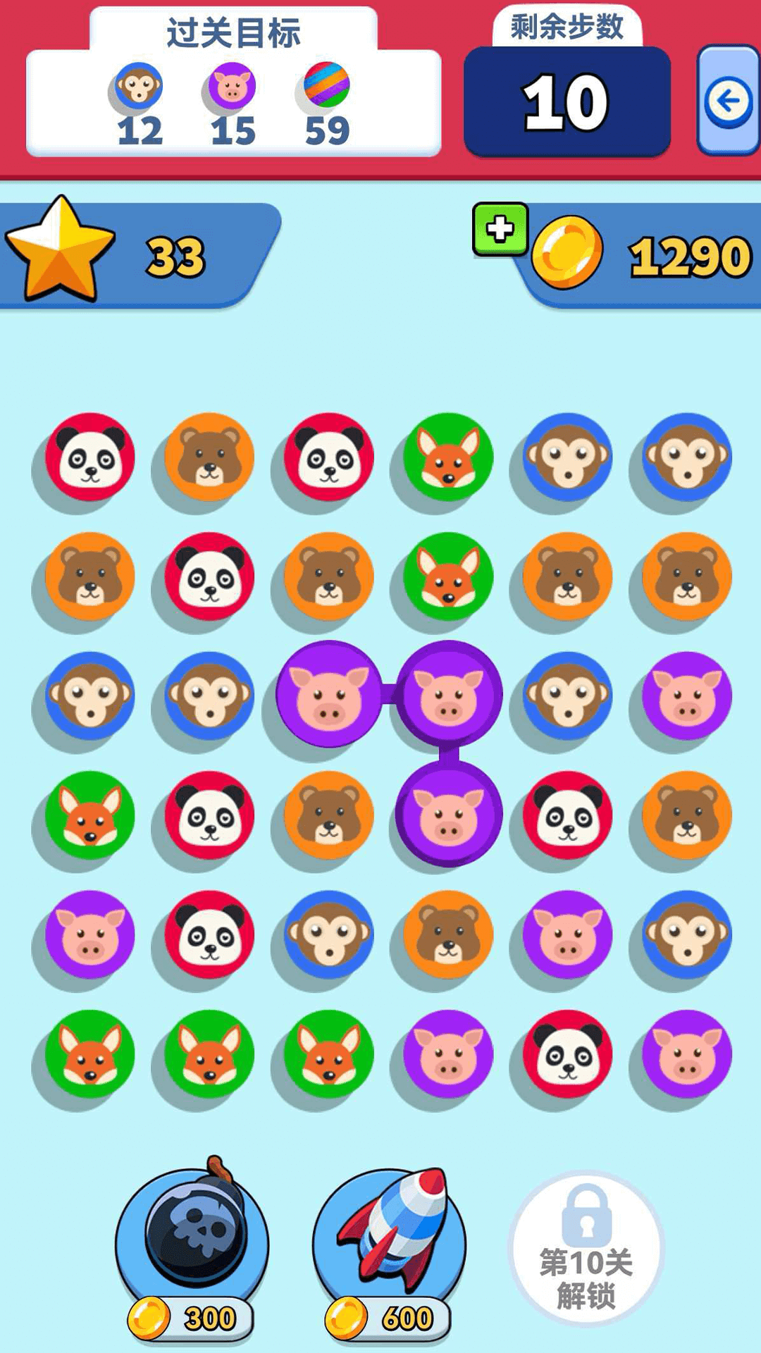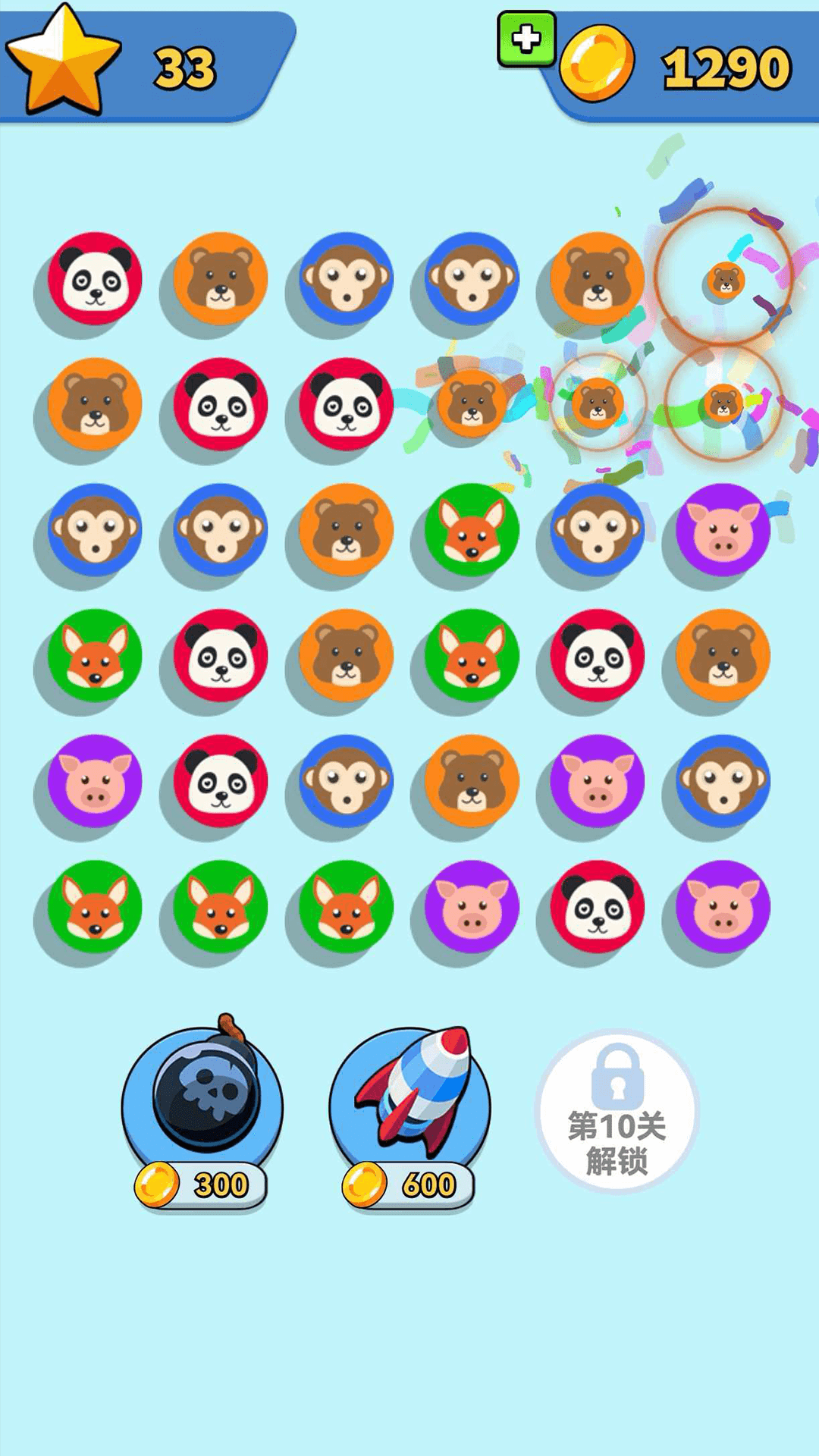 1.以动物徽章为主题的连线消除闯关游戏,画面精致清新,动物形象生动活泼。