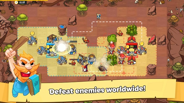 核心操作:触屏画线规划部队进攻路线,建造塔楼、地雷、兵营,兼顾防守与推进,目标摧毁敌方城堡并守护己方主城。