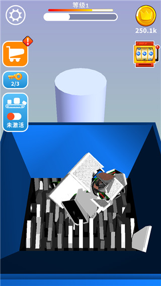 游戏设有大量关卡,每个关卡会指定需要粉碎的物品类型和目标(比如 “粉碎 100 个玻璃瓶”“在 1 分钟内碾碎一辆轿车”)。完成关卡可以获得金币奖励,用于解锁更高级的粉碎机、升级机器的功率和效率,或者解锁新的粉碎场景。