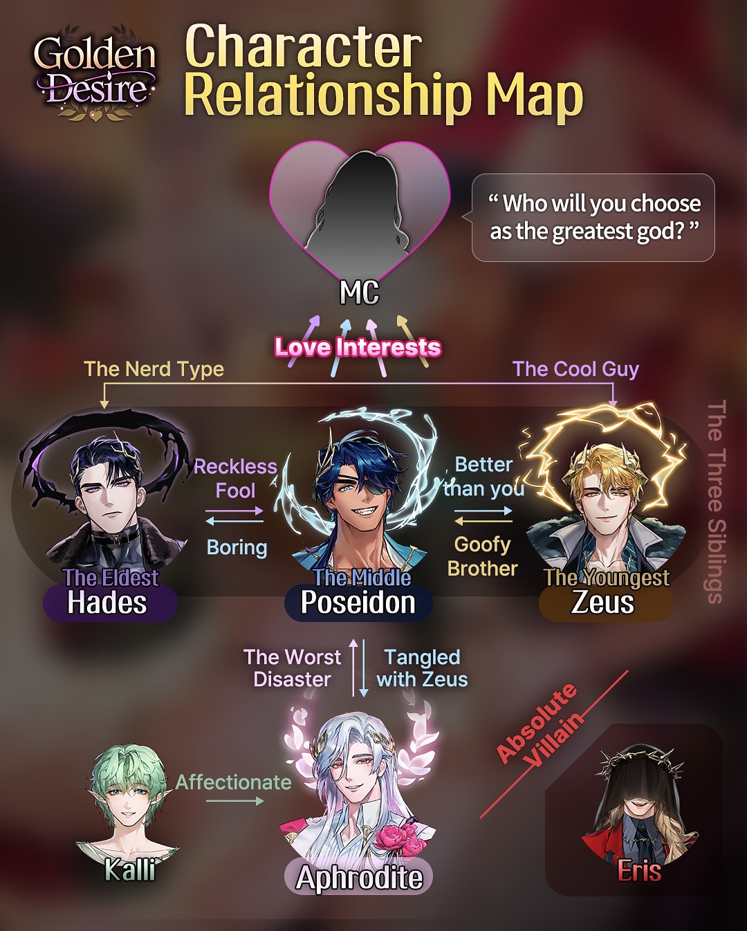 神域之恋(Golden Desire)是一款由 Nordeus 开发的乙女向恋爱手游。游戏灵感源自古希腊金苹果神话。玩家扮演的角色在神之森林中醒来,记忆模糊,在冥王哈迪斯的引导下踏入宏伟宫殿,被众神环绕。当诸神注意到主角肩膀处闪耀的金色铭文 “致最伟大的神明” 时,神界陷入混乱,为平息风波,诸神决定让主角来抉择谁才配得上 “最伟大” 的称号,于是神明们竞相赢取主角的芳心。