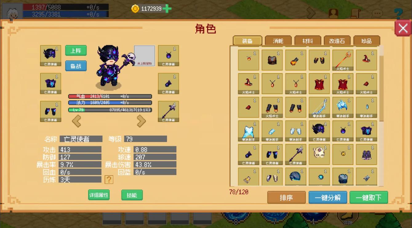 2、点击右上角的角色可以查看自己的属性、职业以及拥有的装备。
