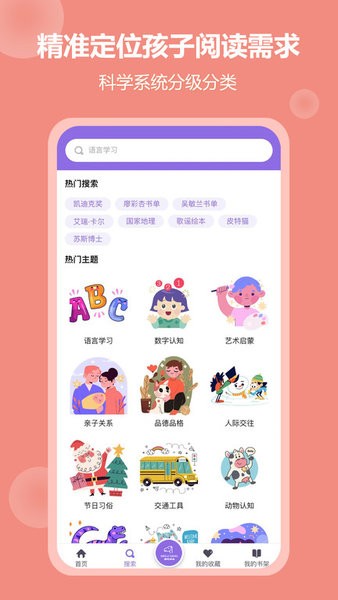 1.童年不留白,平台根据孩子的年龄特点制定主题类型,阶段分类方式智能便捷推荐。