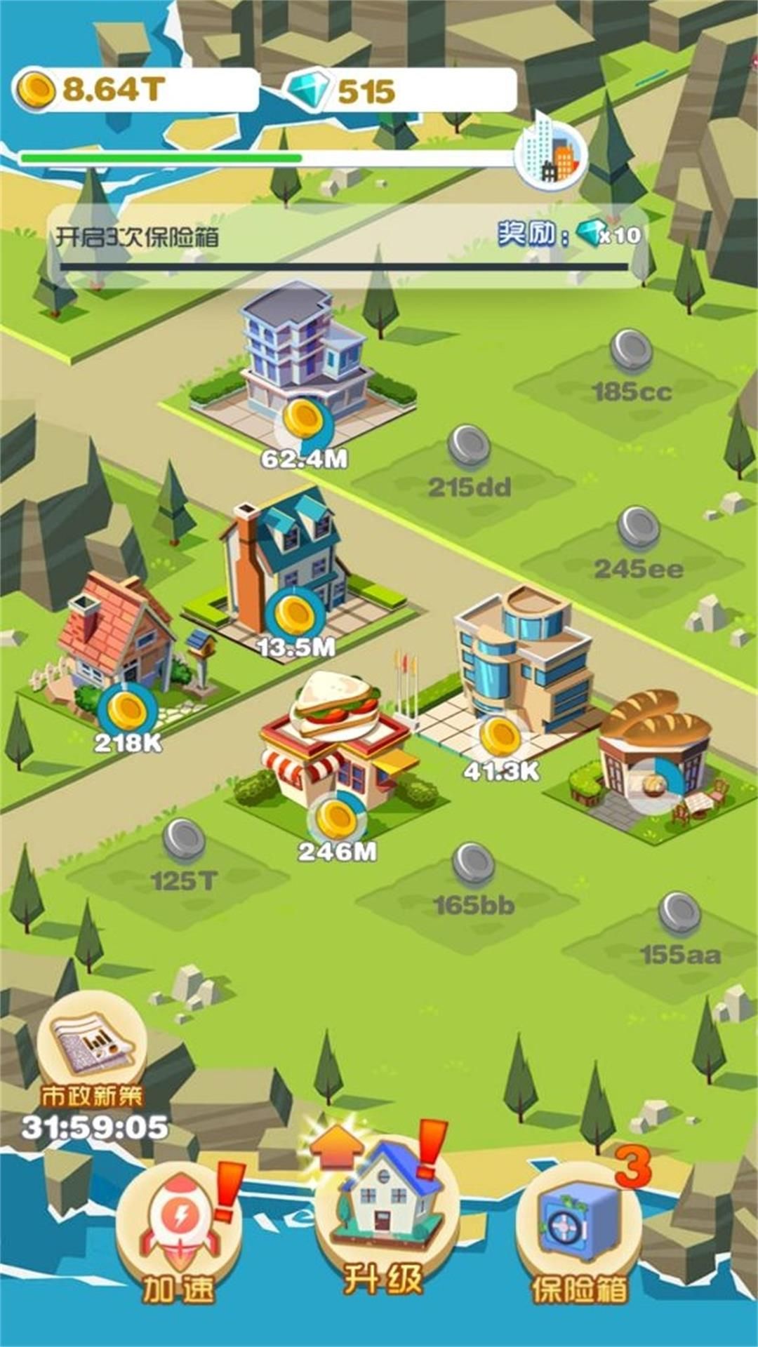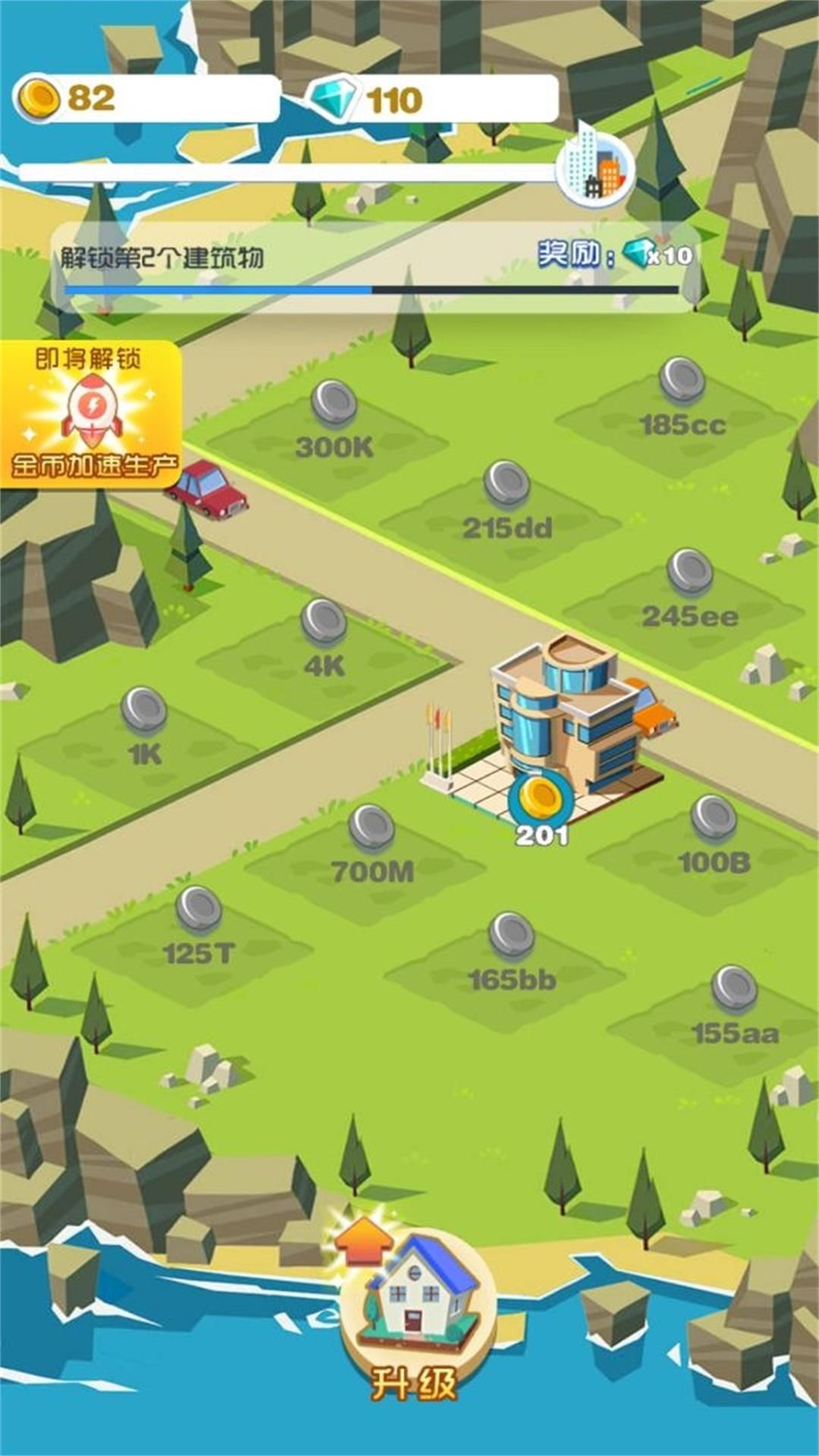 2、简单易上手,通过点击升级建筑,轻松获取资金,积累下财富。