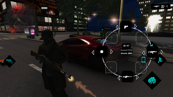 左屏虚拟摇杆移动,右屏设攻击、跳跃、黑客(手机图标)按钮,可控制摄像头、交通灯、引爆装置等。