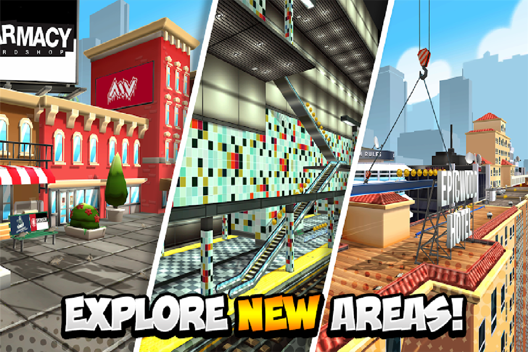 核心循环:刷距离、攒连招、完成目标拿奖励,支持转向、墙跳探索秘密区域。