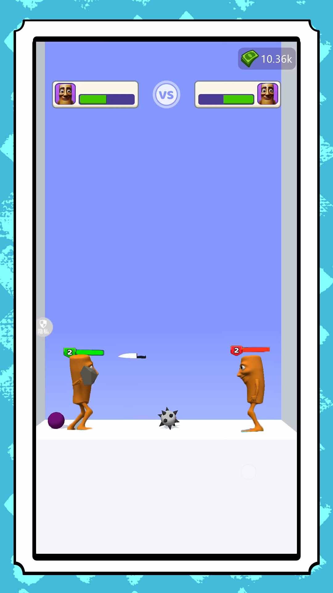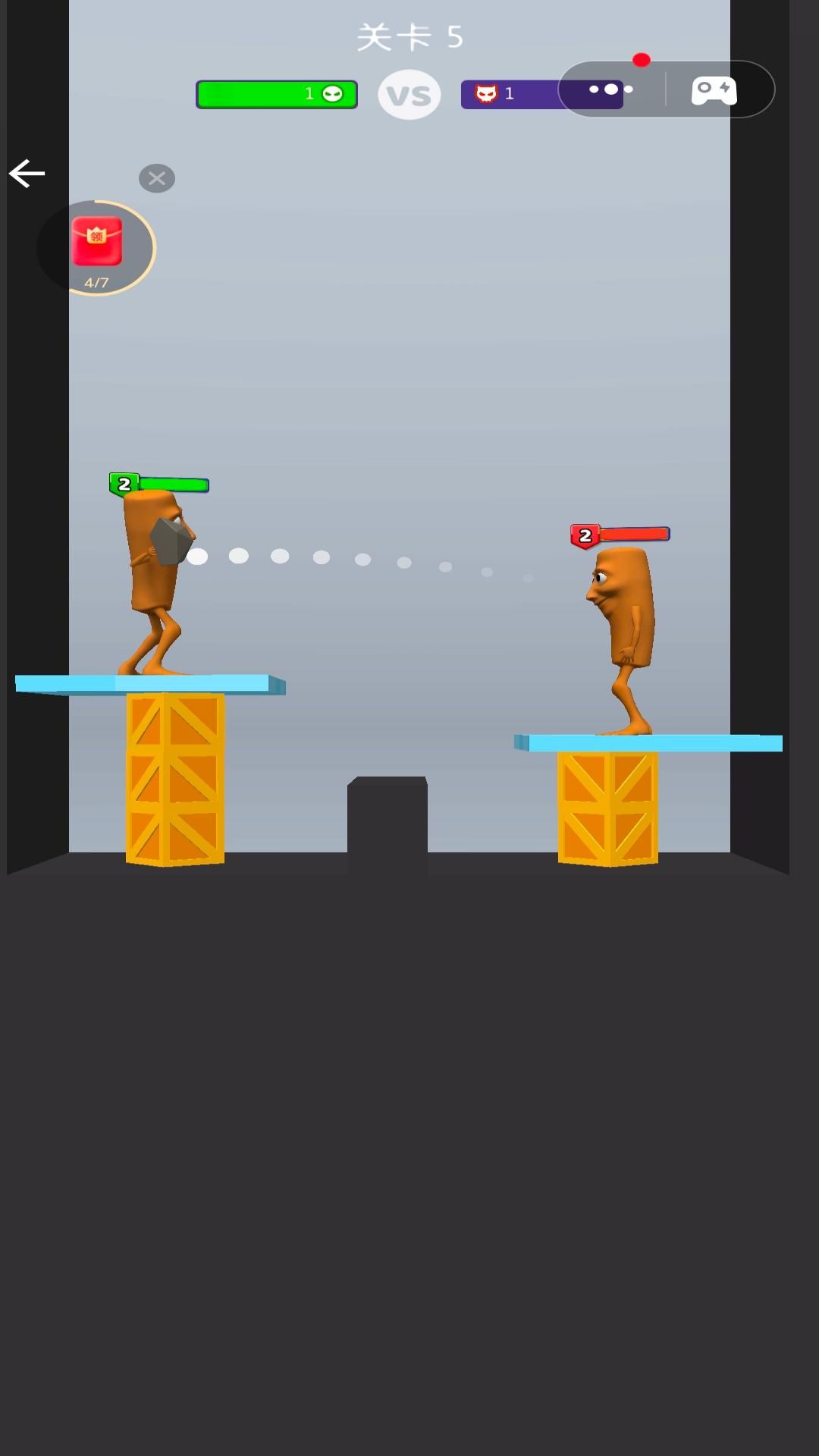 2、物理投射战斗机制,通过拖动投掷武器攻击对手,利用抛物线轨迹与场景陷阱造成伤害。