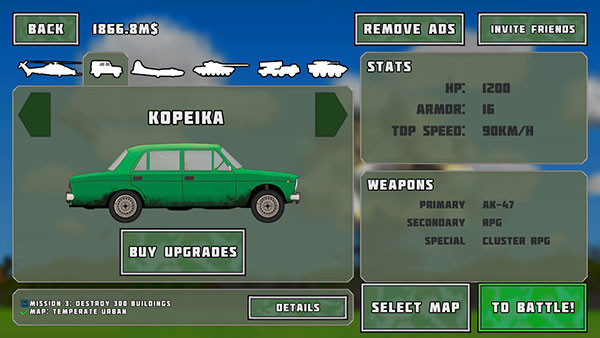 丰富载具武器:20 余种载具 + 多种武器自由搭配,从常规火力到核武器,满足不同破坏需求,还能解锁酷炫载具外观。