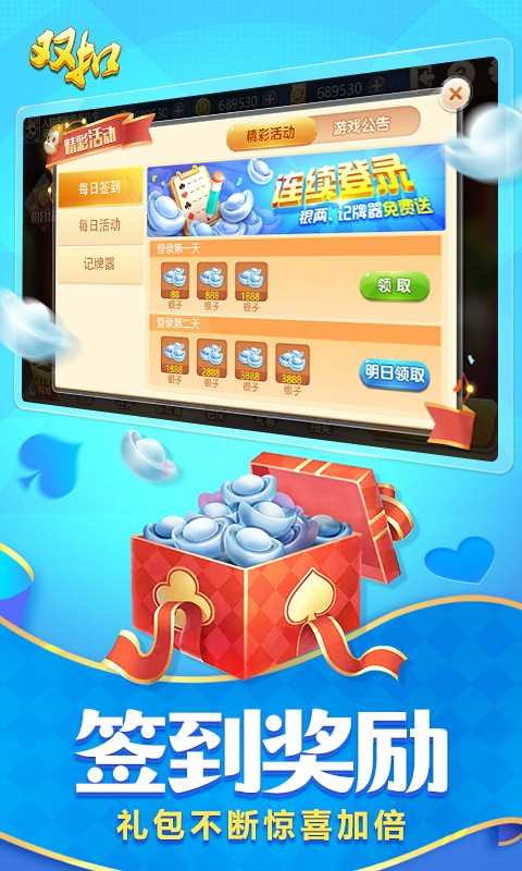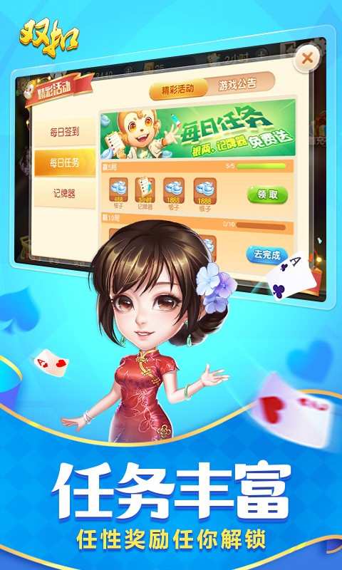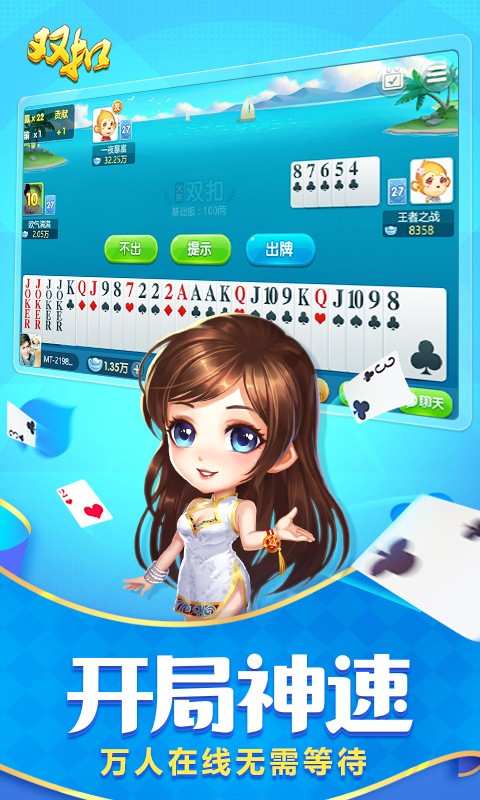 双扣游戏大厅手机版是一款真人益智双扣游戏,超燃的“弃三张”玩法已经震撼上线,每一场对局都能解锁超级丰厚的奖励哦!说到双扣的玩法,那可真是花样百出,火拼双扣场、普通双扣场、千变双扣场……每一个场次里,结算规则、大小王百搭的妙用,还有炸的组成规则,都有着那么点儿与众不同的刺激!真人实战,酷炫特效燃爆眼球,完全免费任你畅玩!还有那可爱的Q版表情,诙谐逗趣的语言,让你在游戏的海洋里尽情畅游,感受满满的热情与欢乐!