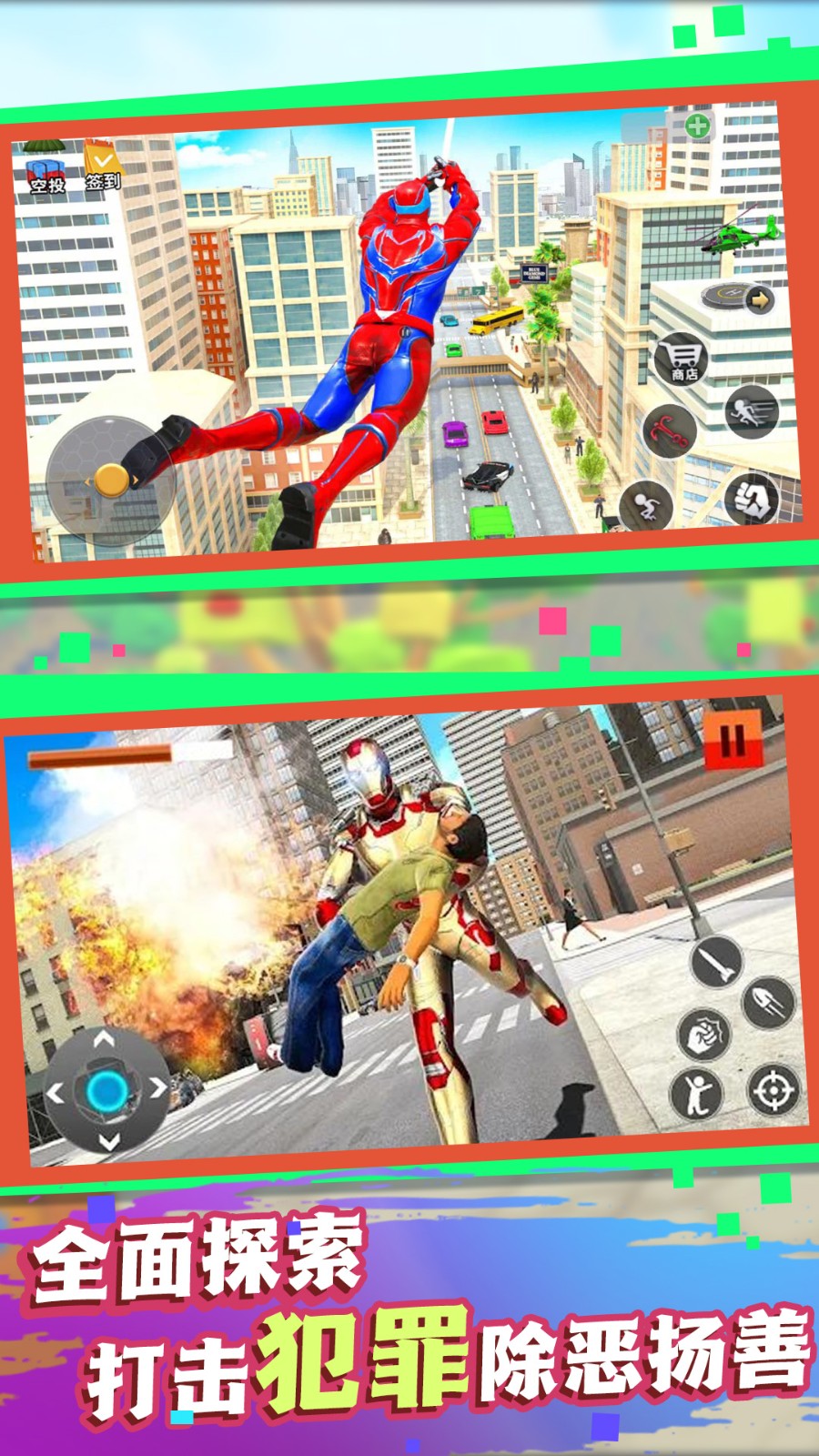 1.超级英雄角色可以过关解锁,超大地图可以自由探索,各种炫酷技能可以过关解锁。